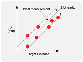 Z linearity is the difference between the actual distance to the target and the measured distance to the target, throughout the measurement range. Z linearity gives an indication of the sensor's ability to measure absolute distance.