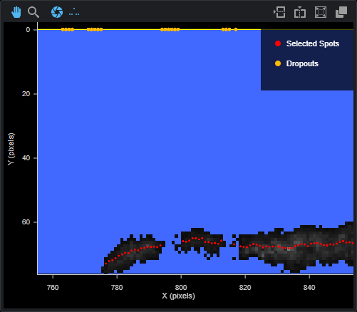 Various material settings can affect how the Material settings behave. In Image mode, you can examine how the Material settings are affected. To do this, in Image mode, check the Show Spots option at the top of the data viewer to overlay a representation of the spots in the data viewer.