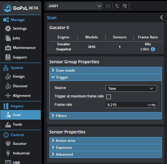 Trigger at maximum frame rate: The sensor triggers at the maximum available frame rate. The frame rate is displayed after this option and also toward the top of the configuration area on the Scan page.