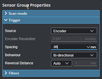 When using encoder triggering (G2 and G5), the current encoder resolution is displayed under the Source drop-down as a reference when setting trigger spacing.
