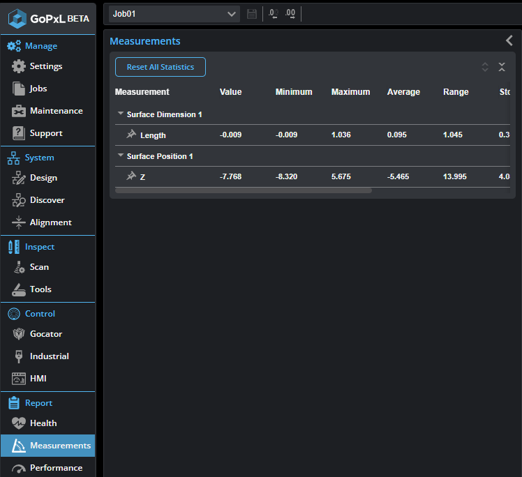 The ReportMeasurements page displays statistics for each measurement enabled in the InspectTools page, grouped by the tool that contains the measurement. Values are reset when the sensor is started. To reset statistics manually, click the Reset All Statistics button.