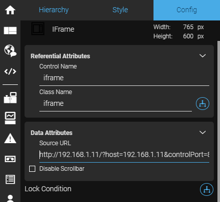The default HMI app includes an IFrame widget configured to display the data viewer. The IP address used in the link is 127.0.0.1:8100, which is valid for a PC instance of GoPxL (if one is running at that address and port).