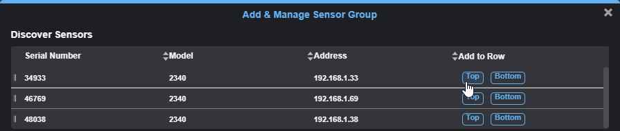 | 3. | In the Add and Manage Sensor dialog, from the list of available sensors at the top, click the Top or Bottom button next to a sensor to add it to the sensor group in the top or bottom row, respectively. |