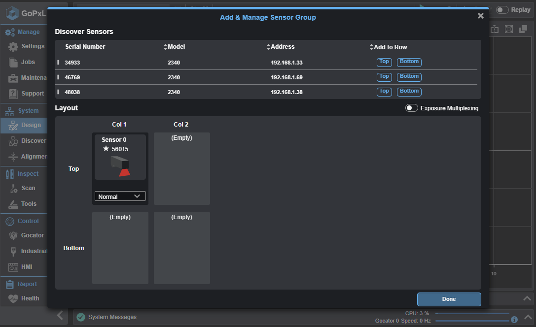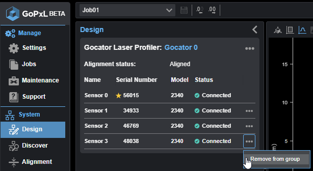| 2. | In the GoPxL interface, go to the System > Design page, click the three dots menu and click Add and Manage Sensors. |