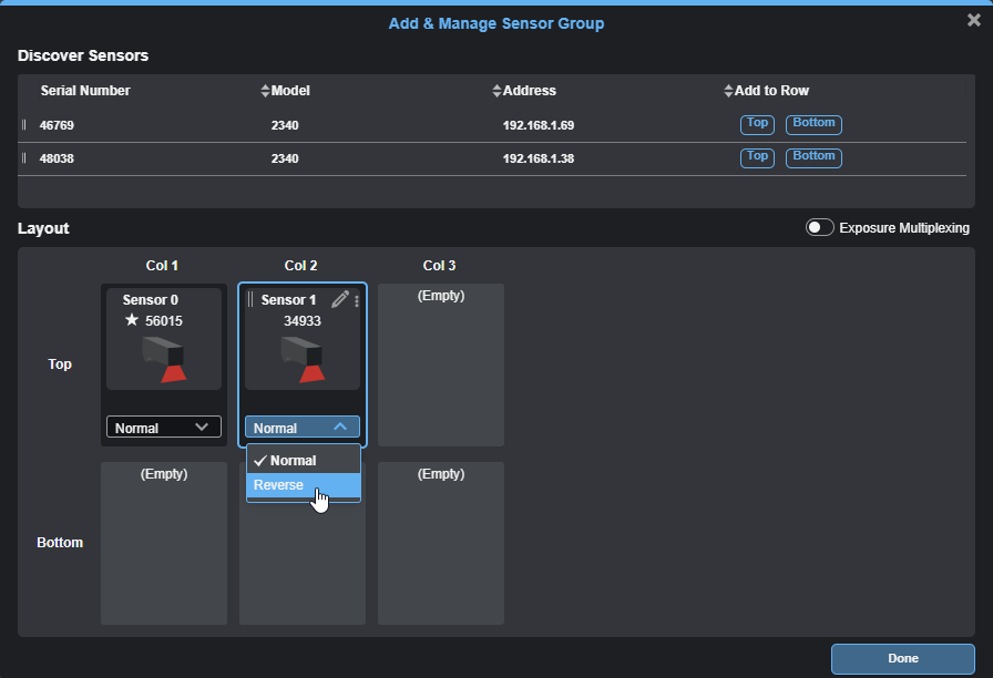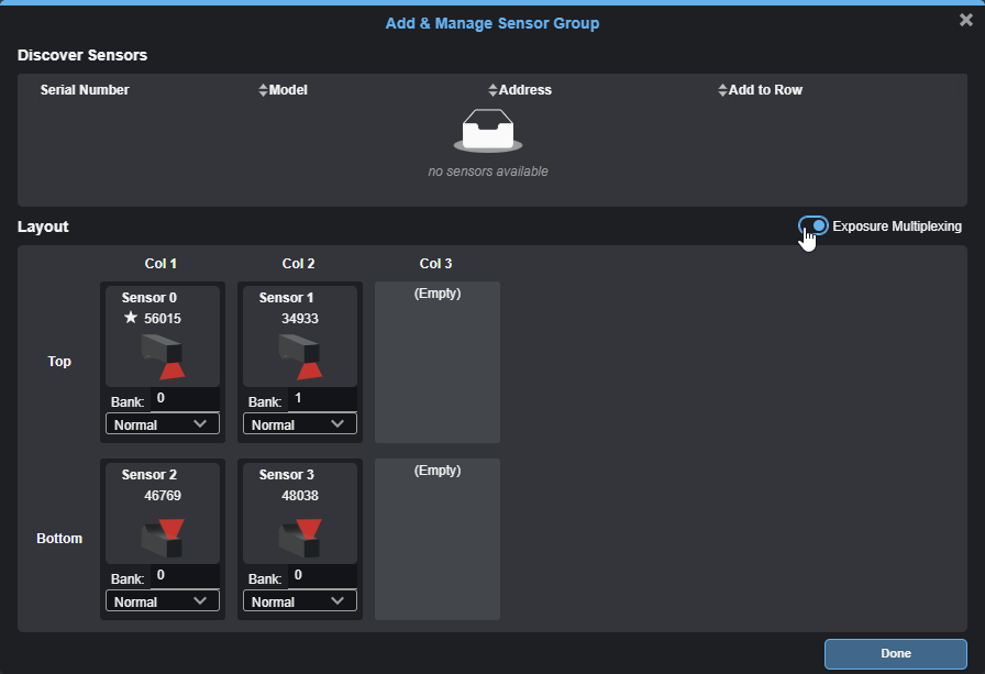 | 1. | In the Manage Sensor Group dialog, move the Exposure Multiplexing toggle to the right. |