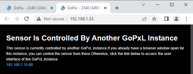 After you have grouped a sensor with another sensor, the grouped (also known as "remote") sensor's web interface will show that it's currently being controlled by another GoPxL instance, namely, GoPxL running on the sensor on which you configured the system.