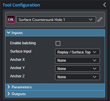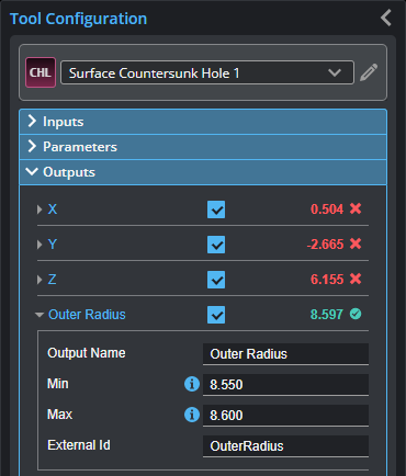 Outer Radius Determines the outer radius of the countersunk hole. When a hole is cut at an angle relative to the surrounding surface, the outer radius is calculated as if the hole were not cut at an angle.