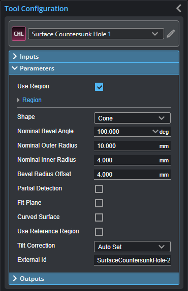 The Countersunk Hole tool locates a countersunk circular opening within a region of interest on the surface and provides measurements to evaluate characteristics of countersunk holes, including the position (X, Y, and Z) of the center of the hole, outside radius of the hole, hole bevel angle, and the depth of the hole. The countersunk hole can be on a surface at an angle to the sensor. The tool also supports measuring holes drilled at an angle relative to the surrounding surface.