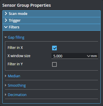 Fills in missing data using information from the nearest neighbor data points, for example, when data is missing due to occlusions. Gap filling also fills gaps where no data is detected, which can be due to low surface reflectivity, for example dark or specular surface areas, or to actual gaps in the surface. The values in Filter in X and Filter in Y represent the maximum gaps the sensor will fill. Wider gaps are not filled.