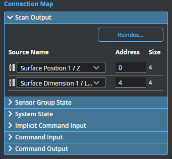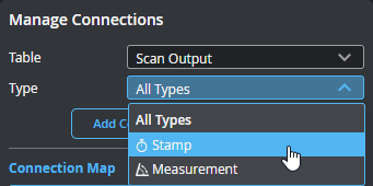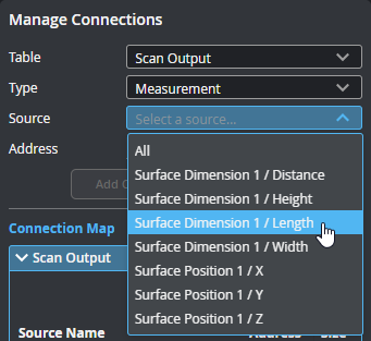 Table When GoPxL is running on a sensor, Table only contains one value (Scan Output) that represents a register assembly. When GoPxL is running on a PC or GoMax NX, Table contains an additional entry (Sensor Group State). Use this parameter to choose which register a source is added to. Type Use Type to optionally filter the connection types available to be added or inserted.