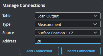 Add Connections Adds one or more connections to the connection map. If Type is set to All Types, all available sources are added. If Type is set to a specific type, the source selected in Source is added (or all sources of that type if All is selected). By default, connections are added directly after the last source in the connections map. You can optionally set the address at which a source is added using the Address parameter.