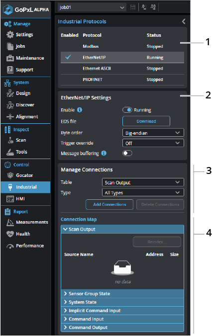 You configure the protocol on the Control > Industrial page. After configuring the EtherNet/IP protocol in GoPxL (see below), use the information in EtherNet/IP Protocol to configure your PLC.