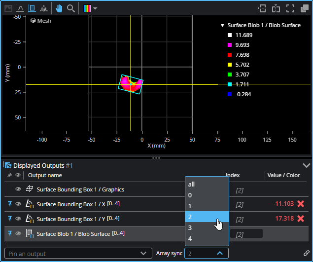 When you are working with arrayed outputs, you can select an array element for display across all arrayed outputs listed in the Displayed Outputs panel. For example, in the following, we see all five objects in an arrayed output displayed. For each element, Bounding Box tool graphics and X and Y measurements, as well as the Surface Blob output.
