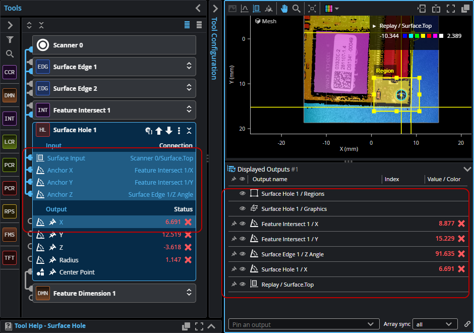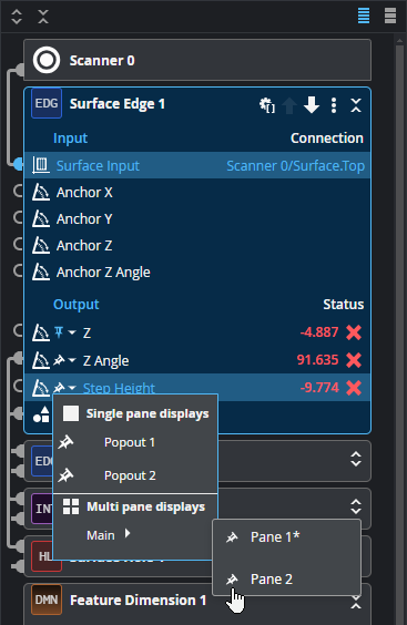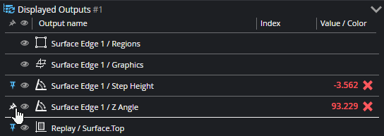 You can “pin” items in the Displayed Outputs panel so that it they are always displayed, even if you select a different tool, or another input or output in a tool block. Pinning items is useful for example if you want to monitor multiple, independent measurements while GoPxL is running in production. Pinning is also useful when setting up tools: you can change the parameters of a tool (such as a filter) earlier in a tool chain and immediately see the impact that change has on another tool (whose output is pinned) later in the chain. This minimizes toggling and clicking between tools and measurements.