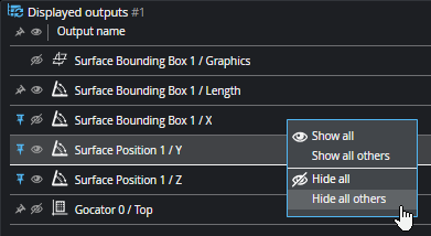 You can interact with the inputs, outputs, and other elements listed in the Displayed Outputs panel to control what you see in the data viewer window, by pinning or hiding outputs. This makes it easier to configure and monitor your application. When you select a block (a tool or the sensor / source at the top) in the Tool Diagram panel, the Displayed Outputs panel lists items related to the currently selected tool. By default, the panel lists all of the selected tool's inputs, the currently selected output of that tool, any pinned outputs, and tool-related graphics. In addition to selectively pinning or hiding outputs, you can right-click on an output in the panel to access "show / hide all" options.