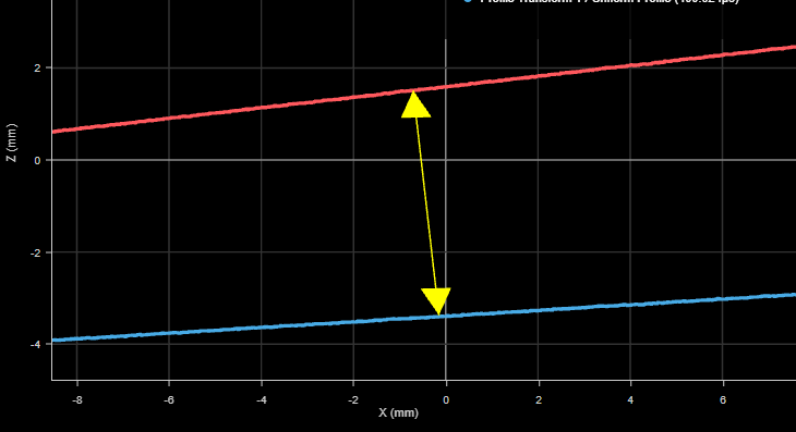 The tool also lets you specify an angle measurement relative to which the tool performs the thickness measurements, up to a maximum of 20 degrees, to compensate for minor tilt of the target. To get the compensation angle, you could first fit a straight line to the top profile using the Profile Line tool, and pass that tool's Angle measurement to Profile Thickness. (For information on Profile Line, see Profile Line.)