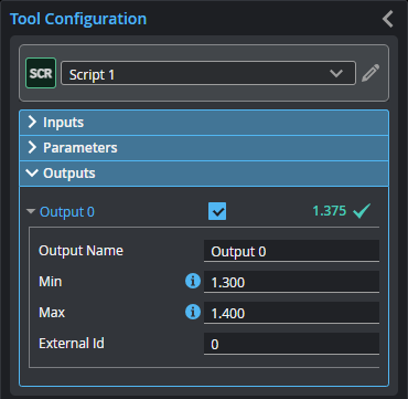 You configure the Min and Max parameters by expanding the measurement in the Outputs section. In order for a measurement to return a Pass decision, the measurement must be between maximum and minimum values; the range is inclusive.