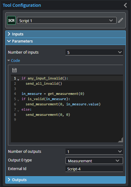 Output {n} Output from the Python script, where {n} is the index of the output. The number of outputs and the type of each output is determined by the Number of outputs and Output type {n} parameters, respectively. |