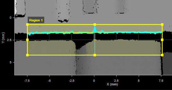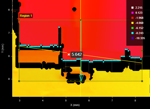 The profile is mirrored vertically when compared to the edge: Note how the single edge point toward the top of Region 1 in the surface data above is at the bottom of the extracted profile (below).
