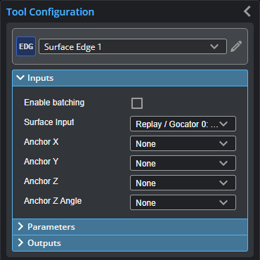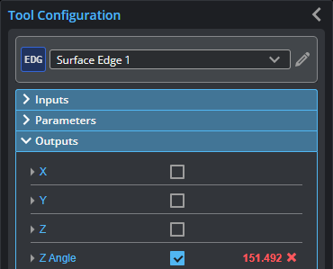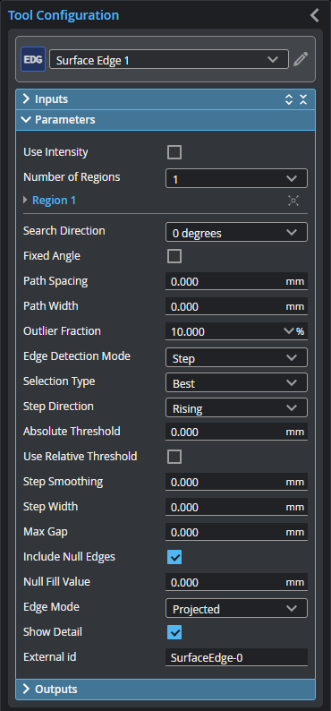 The Edge tool fits a line to a straight edge in the scan data, using either height map or intensity data. The tool can search for an edge using either a step (an abrupt change in the data) or a corner (a contiguous change in the shape of surface). The tool's settings help fit the line when multiple potential edges are in the region of interest. After the tool locates an edge, it returns the position (X, Y, and Z) of the center of the edge line in the region of interest. The tool also returns its angle around the Z axis, the step height between the upper and lower surfaces adjacent to the edge, minimum and maximum error points to either side of the line, and a point count.