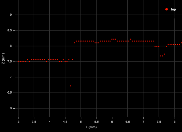 A point cloud profile (Profile Point Cloud) and one or more uniform spacing profiles (Profile Region {n}) representing the edge, respectively, made up of the tool's edge points. The XY positions of the edge points on the surface (cyan dots below) are represented as the XZ positions of the profile points, where X => X and Y => Z. Given the following edge, the resulting profile is shown further below: