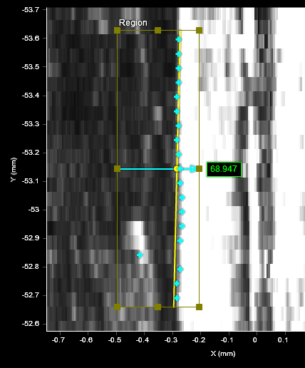 To fit an edge line to the scan data, the Surface Edge tool overlays evenly spaced, parallel paths (light blue lines in the interface; see below) in the defined region of interest. (Note that the paths are only displayed if Path Spacing is greater than 0.)