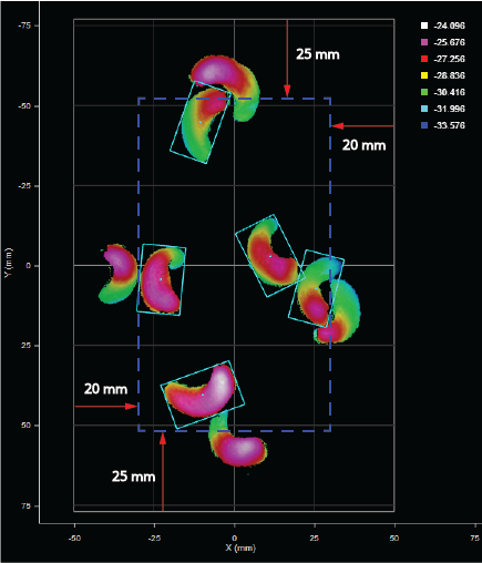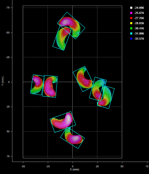 In the following, the left and right margins are set to 20 mm, and the top and bottom margins are set to 25 mm. The sensor's FOV is 100 x 154 mm. The tool discards the four parts whose center points are within those margins. (Total part count is reduced to five.)