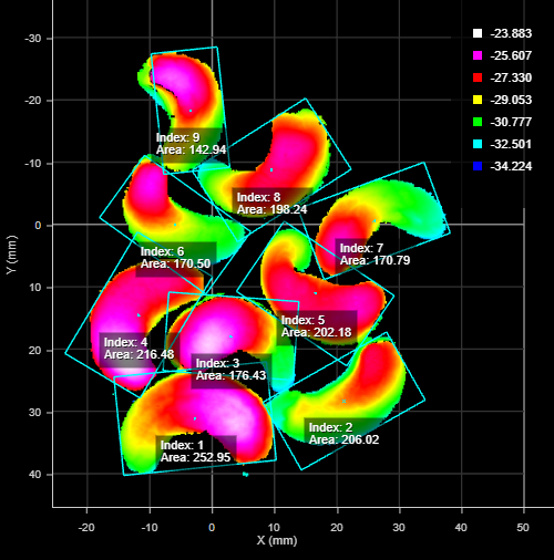 The Segmentation tool separates surface data into "segments," based on the tool's parameters. Segments can be touching and overlapping to a certain degree. The Segmentation tool is especially useful in the food industry, for example to identify food items that are too small or too big, or items that are damaged.