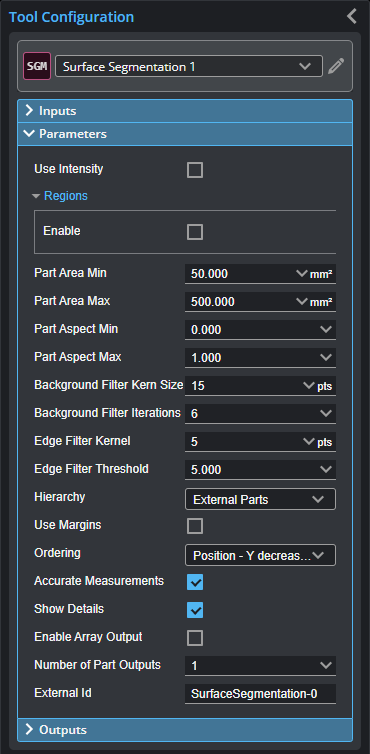 The Segmentation tool can also be used as a second stage of processing after part detection. For example, part detection could be used to detect a tray (containing parts), and the Segmentation tool could then separate the parts within the tray. For information on part detection, see Profile Part Detection.