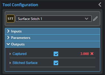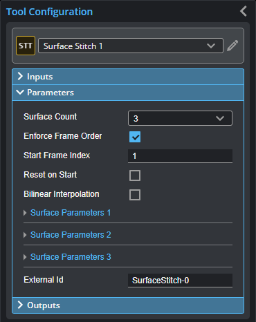 The number of scans to combine into a single surface. For each, a "Surface Parameters" section is added. The tool accepts setting the number of scans to one: in this case it, behaves like a transform tool. |