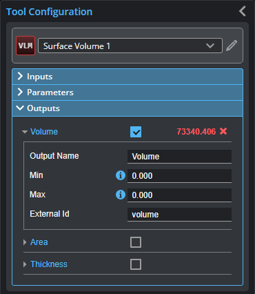 The Volume tool returns the volume, area, and thickness of a part.