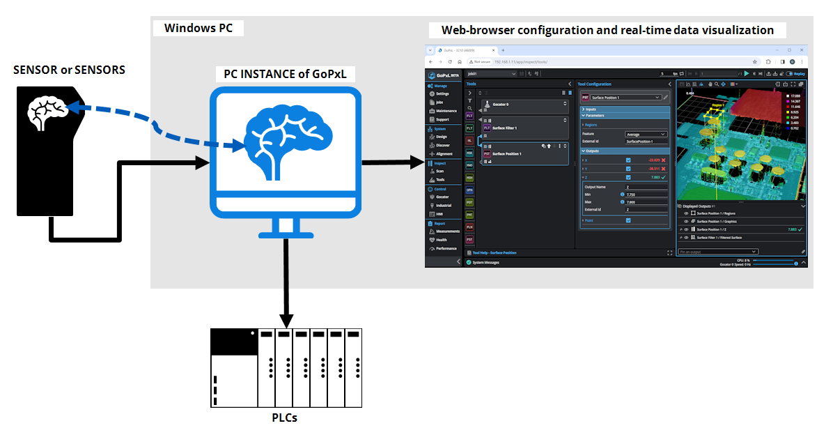 GoPxL is the software you use to configure Gocator sensors. Typically, you connect directly to a sensor's IP address via a web browser, and use the GoPxL software running on the sensor to configure and run the sensor. (By default, a sensor's IP address is 192.168.1.10. If you can't find a sensor, see GoPxL Discovery Tool.)