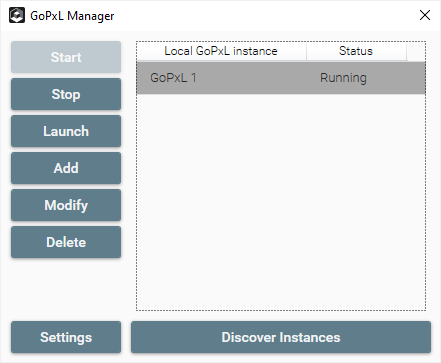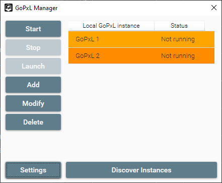 The GoPxL Manager application. An instance is automatically added the first time you launch GoPxL.