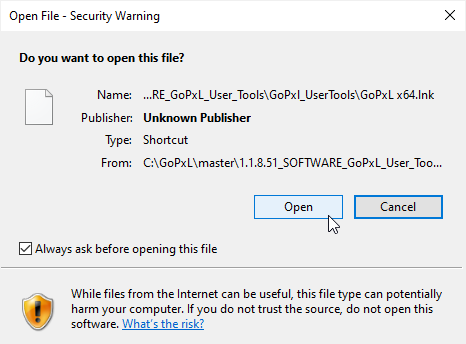 Windows may display a security warning asking if you want to launch GoPxL. Click Open to continue.