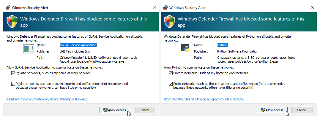 Additionally, your firewall may ask if you want to allow the GoPxL Service Application and Python to communicate over your network. To avoid issues, LMI recommends allowing communication over both Public and Private networks. Because the notifications appear one on top of the other, make sure to check the appropriate boxes and carefully click Allow access for both alerts.