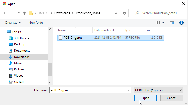 | 2. | In the Open dialog, locate and select the recording (.gprec) you want to load, and click Open. |