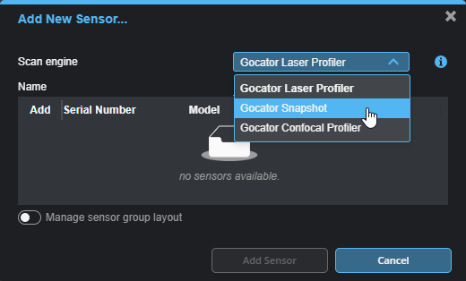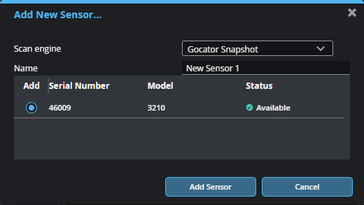 | 2. | In Add New Sensor, choose the scan engine appropriate for your device |
