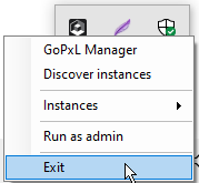 After you have finished making any of the changes listed in Running GoPxL Manager in Administrator Mode, you should fully exit GoPxL Manager to leave Administrator mode to avoid permission issues with your instances as described below. You use the same steps if you just need to exit GoPxL Manager and stop all PC instances. Note that clicking the X button at the top right in GoPxL Manager only hides the utility's main window.