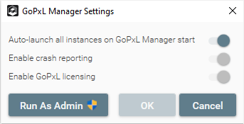 To run GoPxL Manager in Administrator mode, click Run As Admin either in the GoPxL Manger Settings dialog (see Application Settings), or in the Modify GoPxL Instance Configuration dialog (see Instance Settings).