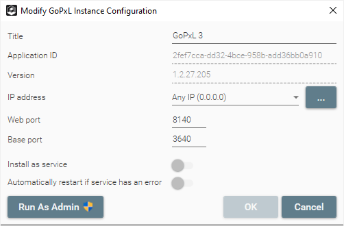 To change the settings of a service instance or delete it, you must be running GoPxL Manager as an administrator. You can do this by clicking Run As Admin in the Instance Configuration dialog (see above), which restarts GoPxL Manager with administrator rights. You can also run right-click its icon in the Windows taskbar and click Run as admin.
