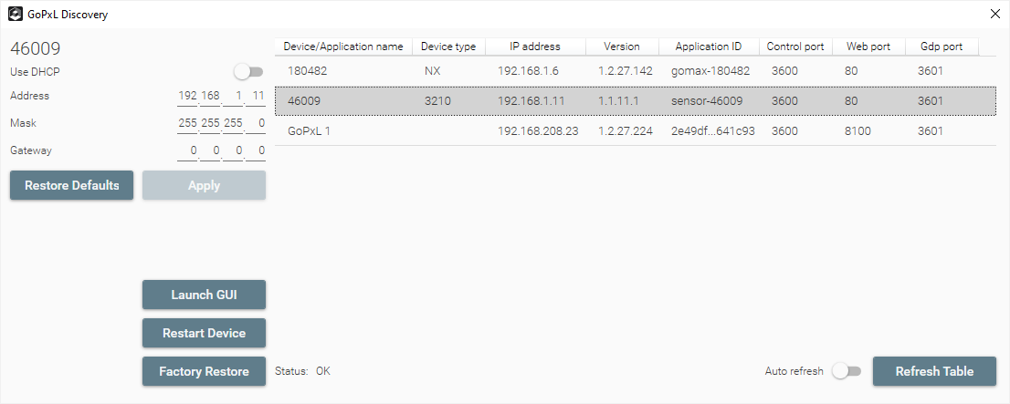 When the GoPxL Discovery tool opens, it lists the sensors running GoPxL and the PC instances of GoPxL that are currently visible on the network. Sensors are identified in the Device/Application Name column by their serial number, and in the Device Type column by their model. If a sensor is running through a PC instance of GoPxL, its status (at the bottom of the tool) is "Device is remotely connected", and you can't perform any operations on it from the tool. Otherwise, the sensor's status is "OK".