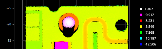 The data viewer displays heightmap information in pseudo-color or grayscale. The height axis (Z) is color-coded in the legend to the right in the data viewer. You can adjust the scaling of the height map using Range and its related settings.