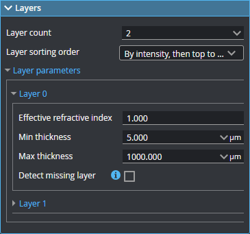 The table below describes the layer-specific parameters available in the expandable Layer {n} sections. Note that Detect missing layer is only displayed for the first layer (layer 0).