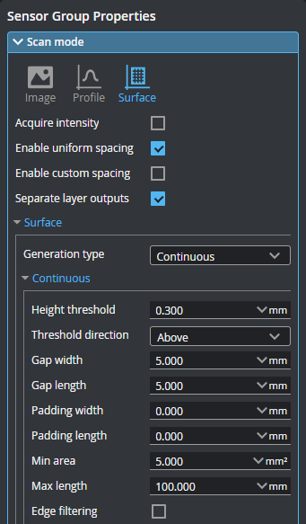 To use this method of surface generation, under Inspect > Scan, be sure to select Surface mode and configure the following parameters.