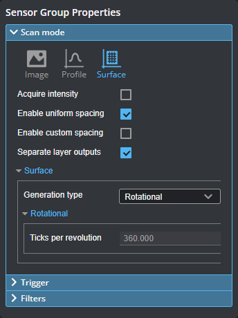 The sensor generates surfaces of a user-configurable fixed length. You must set the length and the start trigger the sensor uses to produce Surface data.
