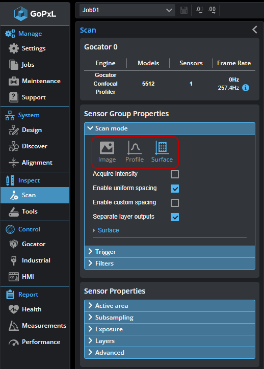 Sensors supports one or more data acquisition modes, in addition to an image mode. You choose the scan mode on the Acquire > Scan page > Scan Mode section.