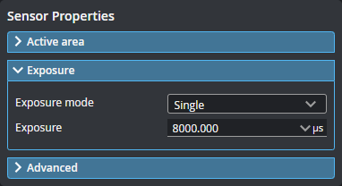 Exposure determines the duration of camera and light-source on-time (or pulse width), given in microseconds (µs). Longer exposures can be helpful to detect light on dark or distant surfaces, but increasing exposure time decreases the maximum speed. Different target surfaces may require different exposures for optimal results. In general, shiny and mirror-like surfaces require a short pulse width and low-gloss surfaces a high pulse width.