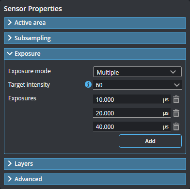 You can define up to five exposures (three for G3 sensors), with each set to a different exposure level. You add exposures using the Add button, and remove them using the trashcan icon.