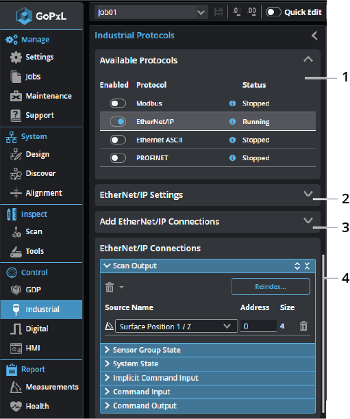 You configure the protocol on the Control > Industrial page. After configuring the EtherNet/IP protocol in GoPxL (see below), use the information in EtherNet/IP Protocol Format - PLC Information to configure your PLC.