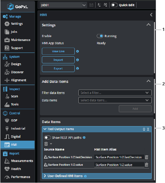 The HMI panel lets you enable GoHMI, choose which outputs you want to send to an HMI application, and launch with the HMI. You can also import and export an HMI.